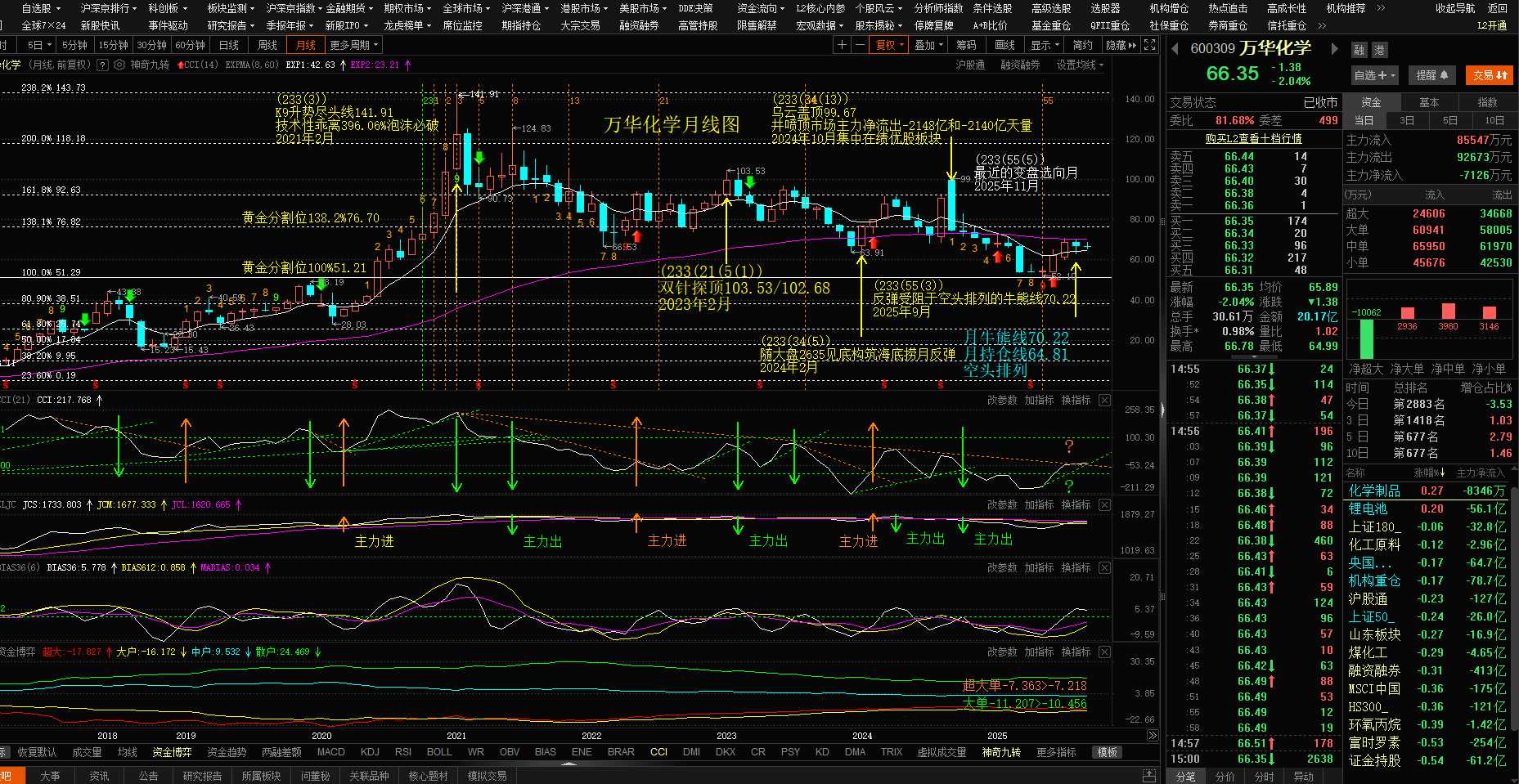 万华化学是784只绩优股之一,但在2021年2月18日与贵州茅台同日创历史新高,月技术性乖离396%泡沫刺破,与贵州茅台同样在基金重仓净流出下股价腰斩,与低价股和举例半导体走出鲜明的对比;低价股距2021年顶997升16.33%(昨收1159.69)。半导体距2021年顶4019.49升5.31%(昨收4232.73)。而绩优股指数现收2075.89,距2021年顶3894.18跌-46.7%接近腰斩!所以,这市场现实际上是公募机构持续减仓,游资大户活跃,新增股民(初生牛犊不怕虎)追逐下非理性击鼓。这从基本面看出,标的 ROE 收益 营收 利润,市净率低价股-1.04%0.03元-11.9%-140%,1.21%半导体1.75%0.14元+10.2%+42%,6.06%绩优股12.5%1.10元+22%+18.2%,1.45%这样看出吗?下为万华化学月线图解,慢慢消化! //@股海翱翔55 :看看一直研究上市公司基本面的财务翻译今晚怎么说:别高兴太早,今天A股深V大逆转,背后却藏着一个危险信号!市场传递信息:公私募机构除保险重仓和新进仓主力资金流入6.43亿和4.93亿,其他全部做空净流出-124.69亿~118.09亿~-38.7亿!稀土板块升9.84%;炒消息主力净流入11.23元,但板块市盈率115倍,银行升0.52%;主力净流入10.65亿,板块市盈率4.9倍。半导体升1.92...