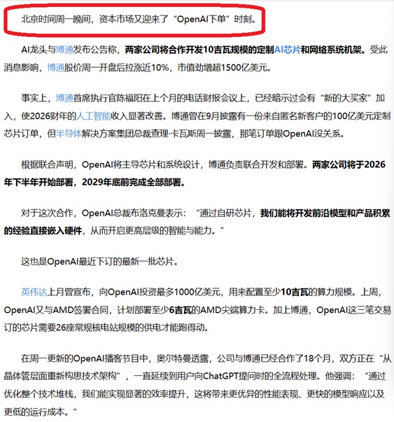 AI龙头与博通发布公告,两家公司将合作开发10吉瓦规模定制AI芯片和网络系统机架
