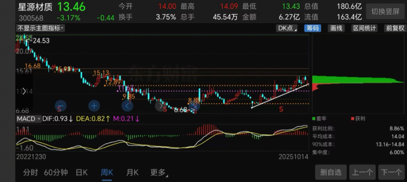 4.在星源材质上,我将投入两年的时间,为什么?其实我当初选的不是星源材质,是固态电池:因为固态电池将是未来科技的变革,这不是迭代升级,这是一种质的改变!固态电池的研发会改变:汽车,低空经济,储能,消费电子……的实质。固态电池分里面的物质,硫化物氧化物聚合物这三大类物质,现在各搞各的,都在研发,至于最后怎么样,不知道!研发阶段,各凭本事吧!里面还有阳极和负极材料,当时我还自选了道氏技术和翔丰华,现在看来道氏技术更强劲一点。但是现在物质也好,阳极阴极也好,很多企业可以生产,竞争力度不小。固态电池需不需要隔膜?这是一个争议的话题,但现在搜索下来,应该会用骨架膜,就算不用骨架膜,星源材质其实也布局了硫化物并实现了量产,并和很多研发固态电池的企业进行了深度合作。另外子公司一直在收购日本磁性材料公司的股份现在是5.02%,但我不知道具体深层的意义是什么?是单纯的股市资本投资还是企业深层合作投资?产品合作投资?这需要后面验证,但是一家公司求变,总是好事!故事多,资本也好讲!