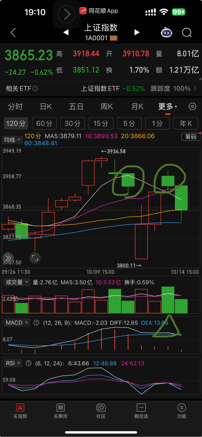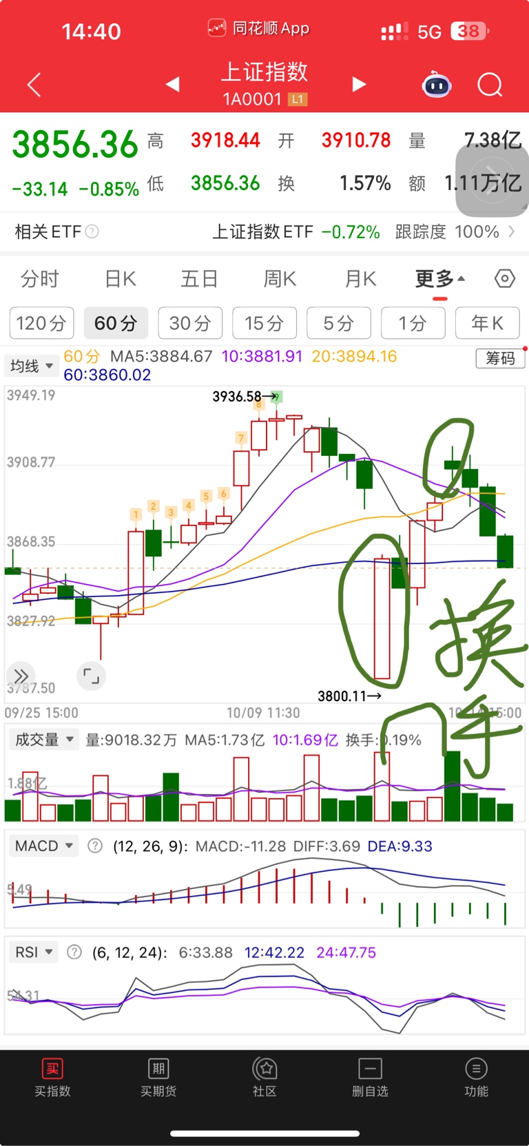 这是2小时级别确立跌。管住后面的24根,接下来24根应该都不会好,都属于调整级别「明天3895见高点,未必能到。重仓的高点供你参考」还记得我说的高开未必就高走,低开一定别久留,大盘如此,个股如此吗?你看看下图: