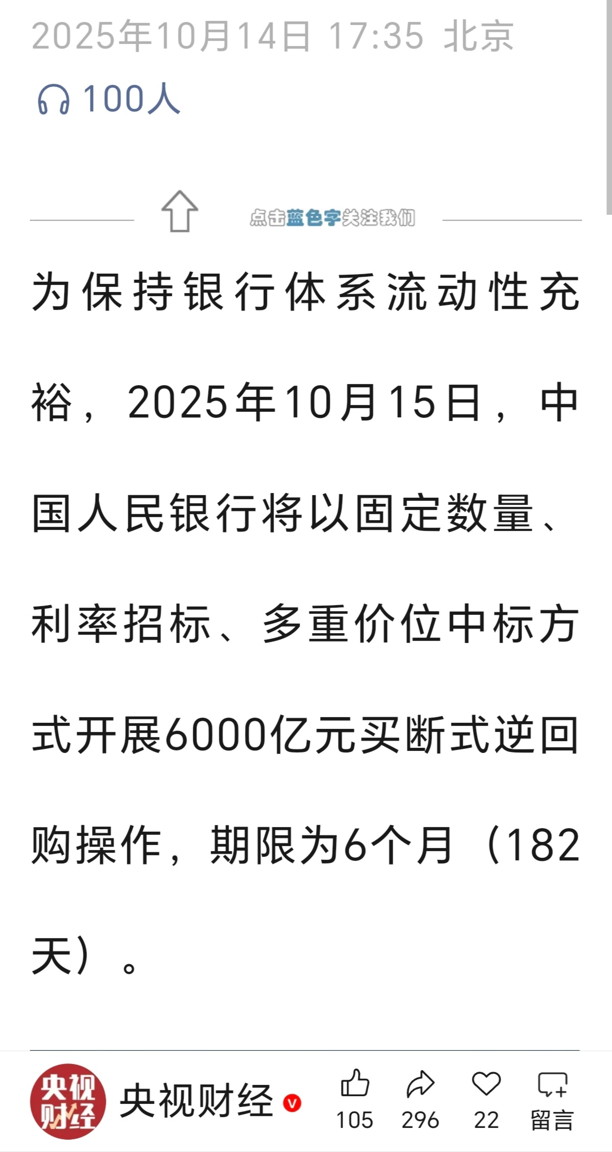 央行又来6000千亿半年期的逆回购了。为保持银行体系流动性充裕,2025年10月
