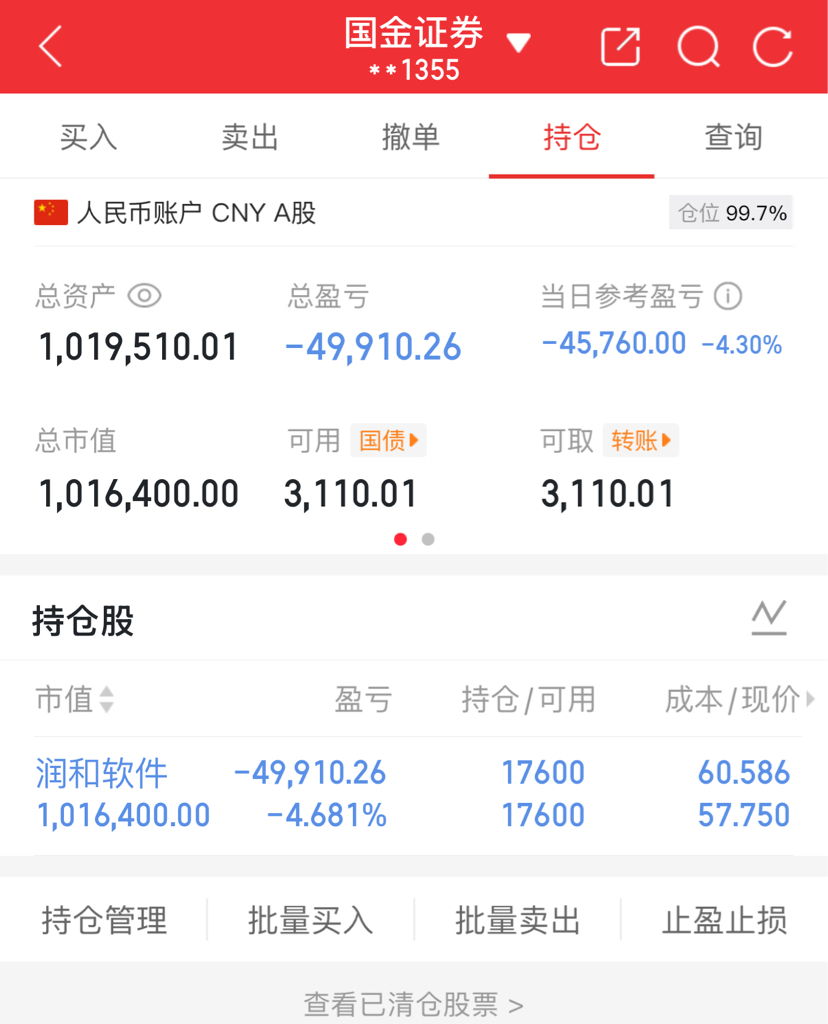 50w实盘挑战一年做到300w(第57天)总资产1019510当日盈亏-4576