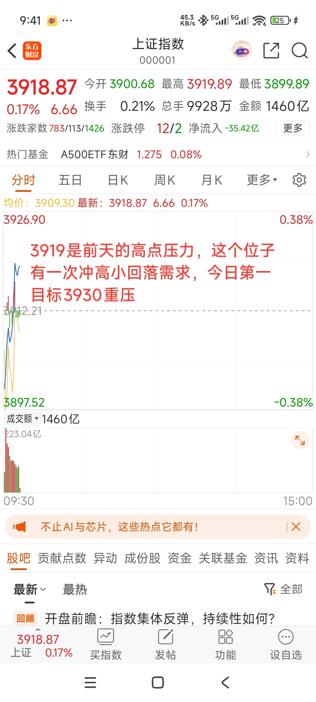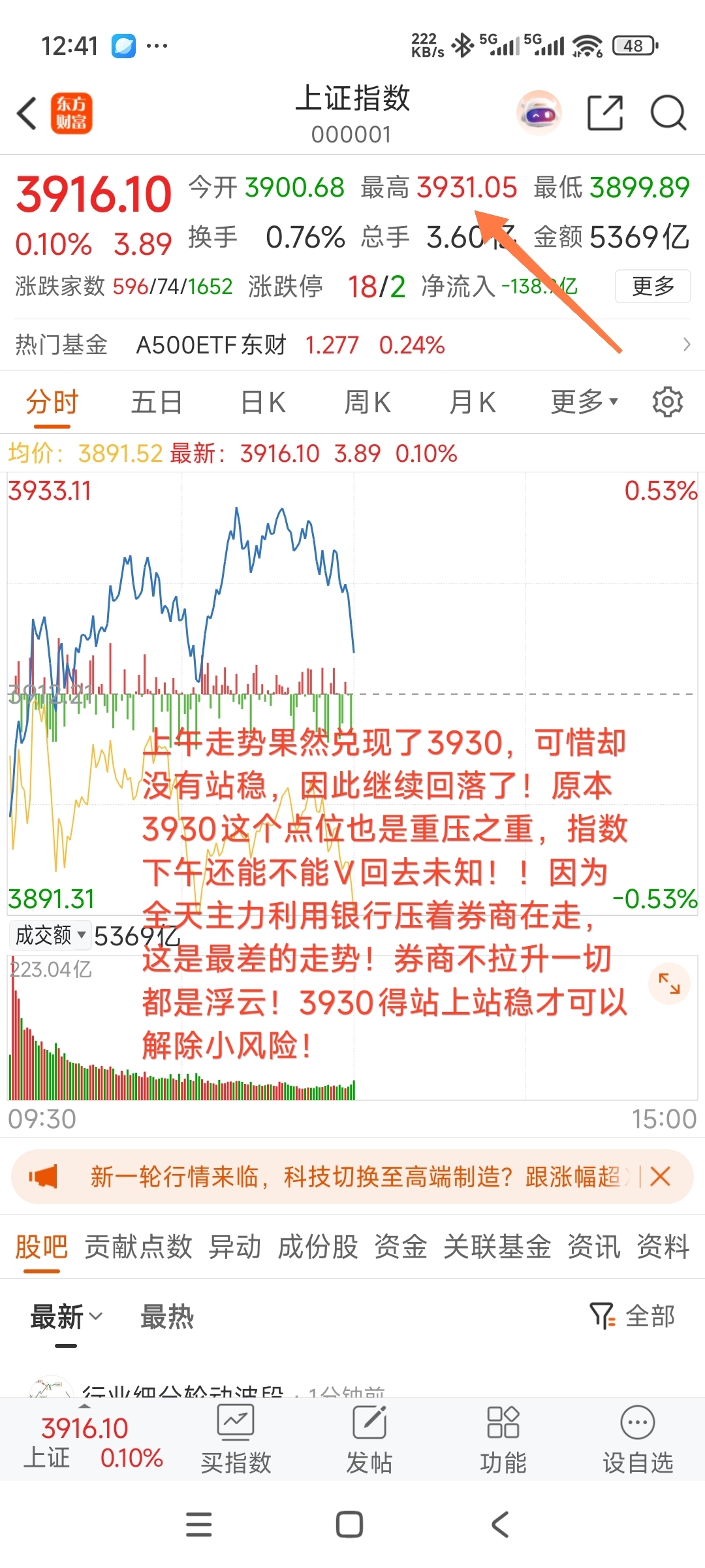 $上证指数(SH000001)$ $东方财富(SZ300059)$ #炒股日记# #复盘记录# #强势机会# 上午走势果然兑现了3930,可惜却没有站稳,因此继续回落了!原本3930这个点位也是重压之重,指数下午还能不能V回去未知!!因为全天主力利用银行压着券商在走,这是最差的走势!券商不拉升一切都是浮云!3930得站上站稳才可以解除小风险!