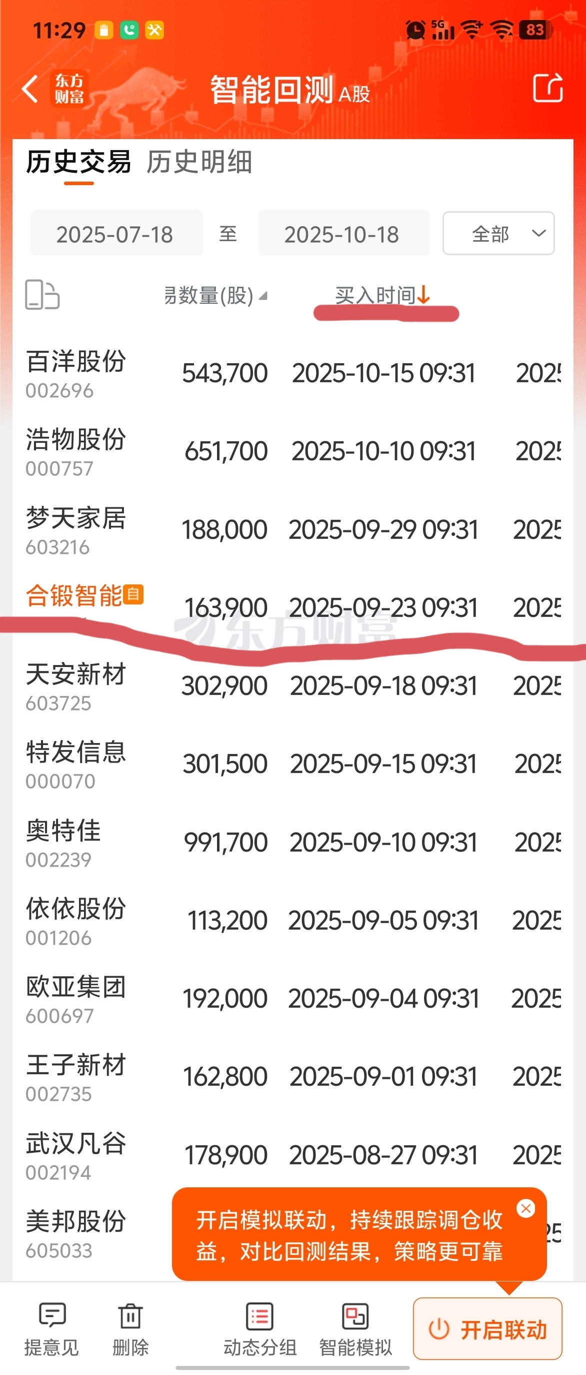 图3图4是策略出票情况,截图是收盘后做的,但出票时间是9:25,图5是委托成交情况,海通发展因为委托价打低,未能成交,结果几乎秒板,永达股份被套3个点。合锻智能策略选出时没有截图,不过回测系统里显示9月23号买入,基本还原了实盘情况,具体看图6;神马电力那个策略是按主力大单选的,里面股票随时都在更新,当时没有截图,因为买入时间和系统不一致,回测系统也看不到。