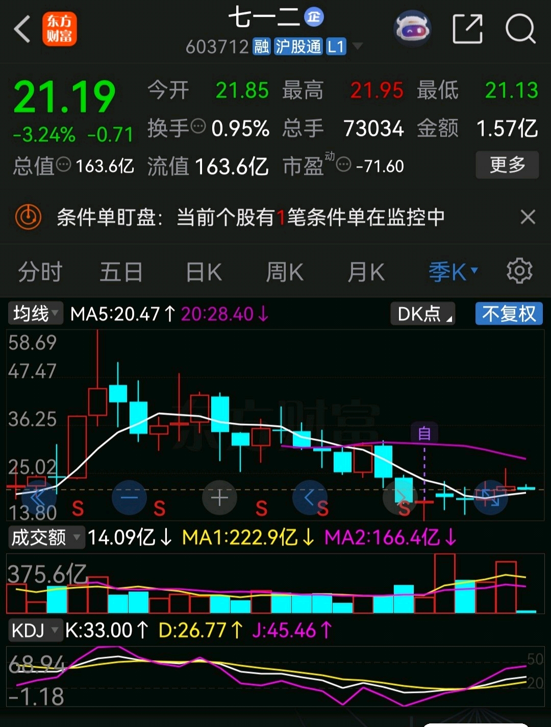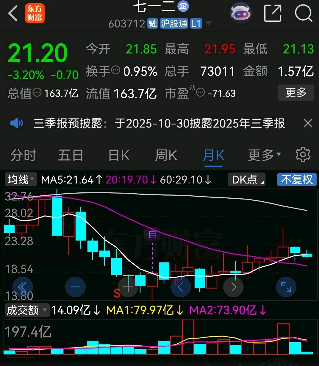 712本月最低点能破一下上个月最低点20.57元?本季度最低点能否破一下上季度最低点19.68元不?破了就看拉起,不破不立。