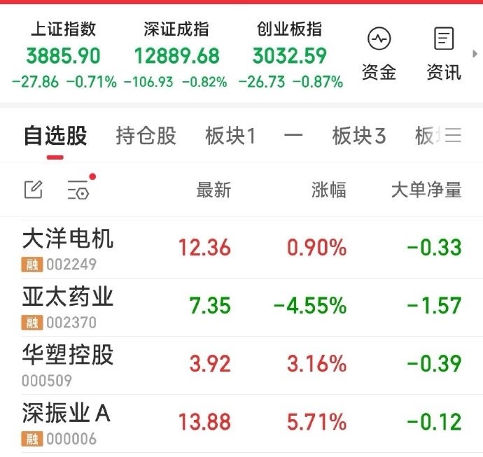 大洋电机为昨天所入,亚太药业,华塑控股,深振业A为今天所入。