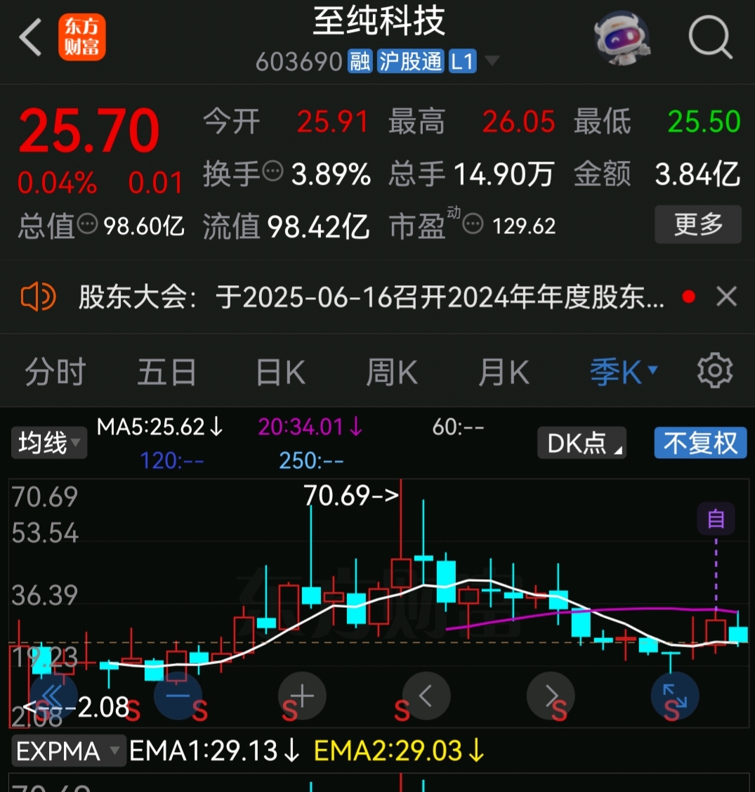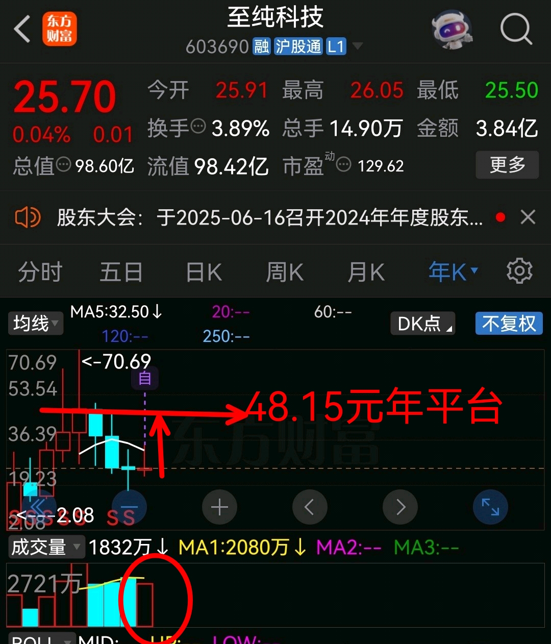 目前至纯回踩25.6元左右和成飞回踩16.8元类似,那么任何25.6元以下(24.6—23.6—22.6元都可以分批低吸 (目前不知道会不会有 或许下个季度初有?但是喜欢的怕踏空的可以逢25.6元左右建点仓试盘感,后面即使调整低点分批低吸就完了))