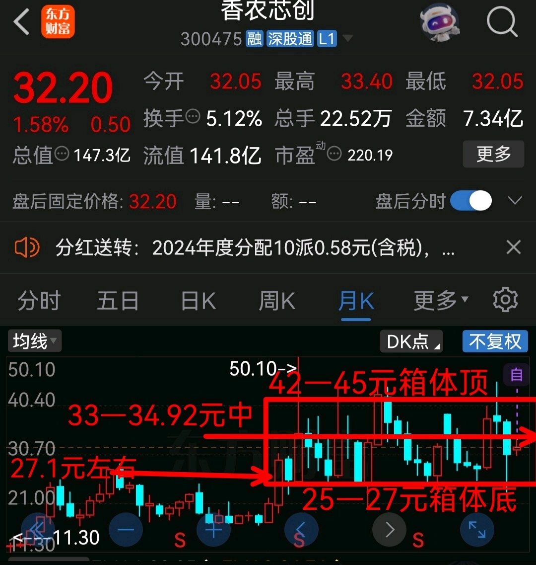 箱体顶42—45元,中轴33—34.92元,箱体底27—25元(惯性25元以下都是给你送金元宝,四月初跌到27元发帖忽悠低吸的)