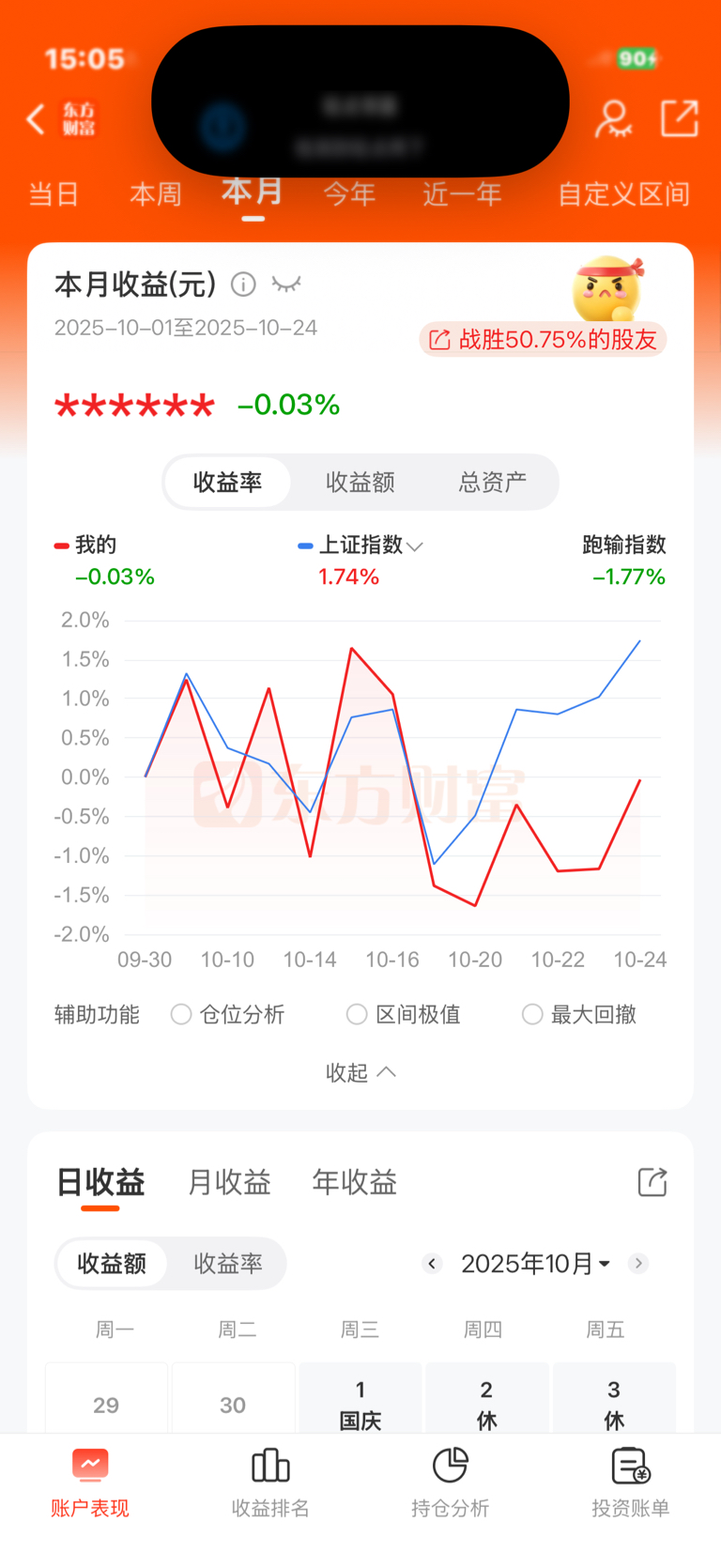 $上证指数(SH000001)$ 本月努力回本中。指数新高了,但持仓本月还略亏。不过令人高兴的是,就这样还能战胜超过50%的股友,说明比我亏的多的大有人在啊