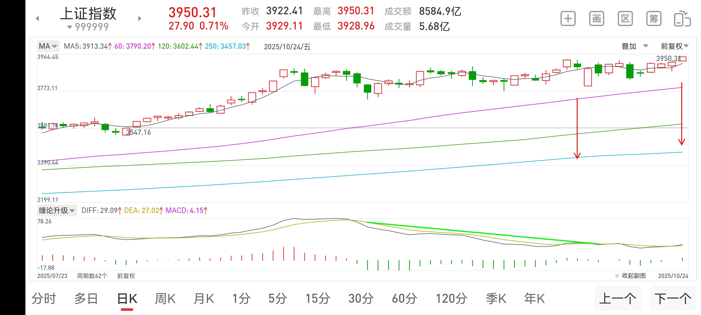根据以上日线走势图:今天收盘在3950点,上方红箭头所示,已形成第二个顶背离结构或者说正在形成第二个顶背离结构中!