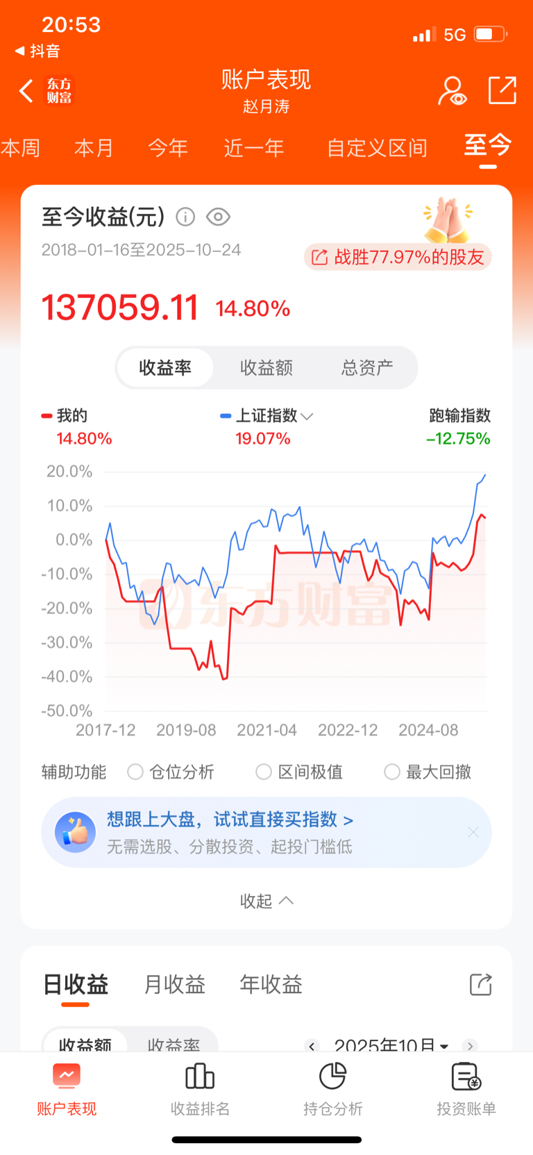 $上证指数(SH000001)$ 玩股票至今一共8年,收益率能不能超过百分之50的人。
