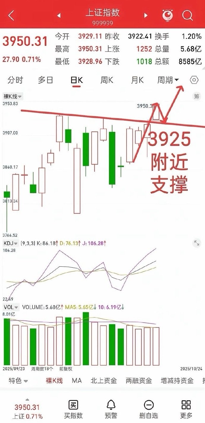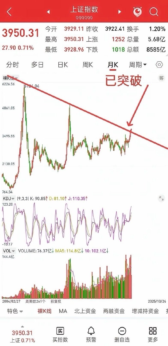 大盘今日也正式突破下降趋势线压力3925附近,下周有两种情况,加速拉升,或回踩3925支撑不破(压力变支撑),再拉升。