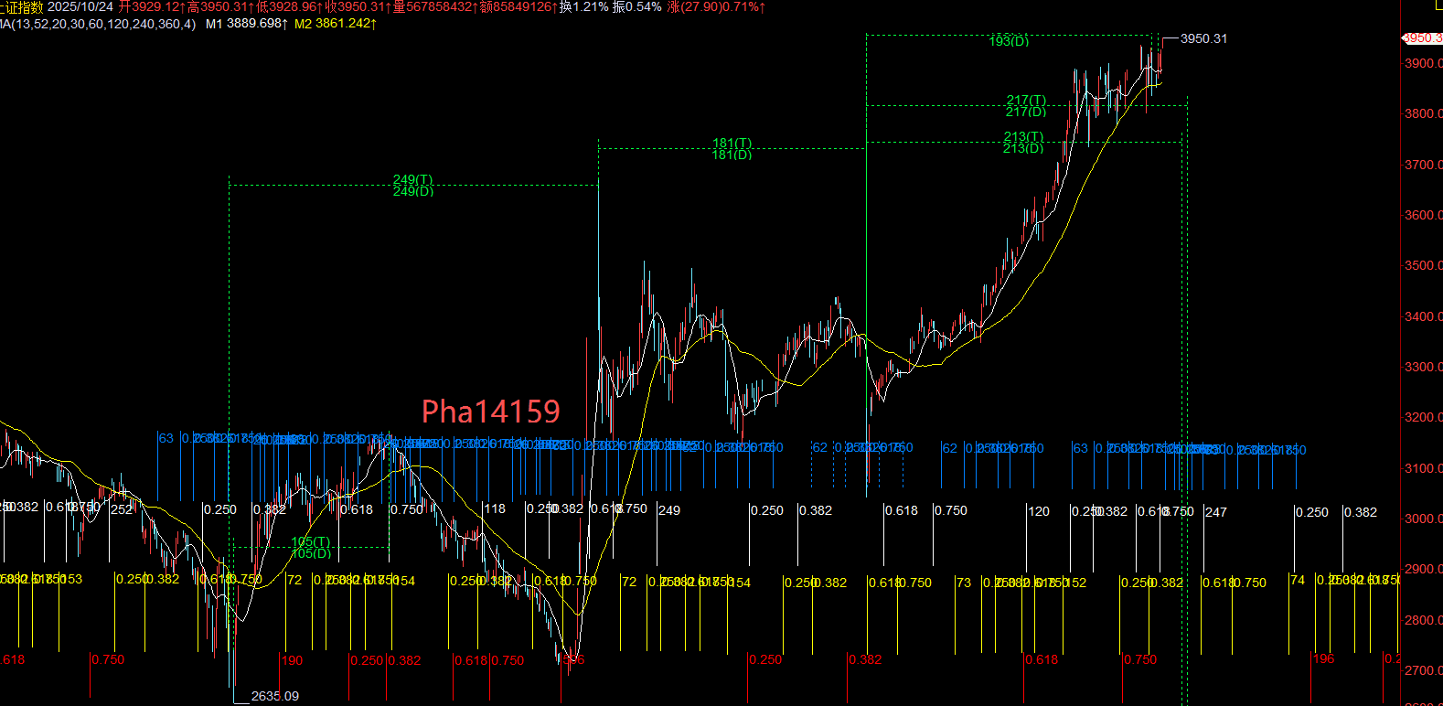 废话懒得说,根据周期的预测要小心今年末出现大跌,其实从9月开始就是周期叠加横盘状态,再加上今年4月上来至今的6-8个月周期,这里很容易出现大幅度下跌,或许明年2月还有个次高点,反正仓位重的这里别太兴奋,信不信随意,这是我上证这里发出最后的警告。有兴趣的可以看我之前的预测贴,也可以在图中寻觅本人。就这