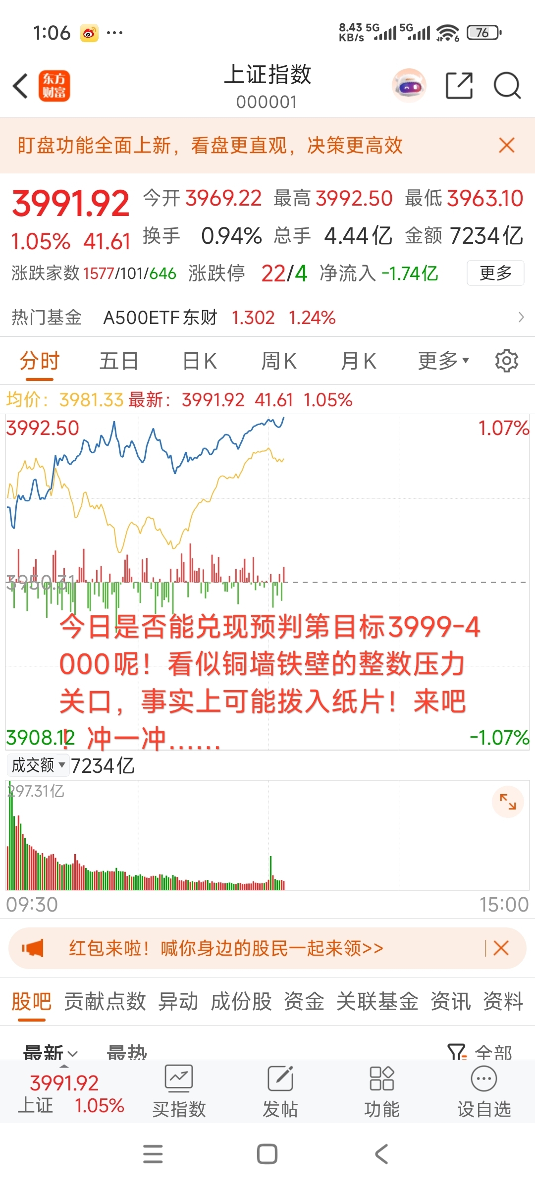$上证指数(SH000001)$ $东方财富(SZ300059)$ $三六零(SH601360)$ 今日是否能兑现预判第目标3999-4000呢!看似铜墙铁壁的整数压力关口,事实上可能拨入纸片!来吧!冲一冲……#社区牛人计划#