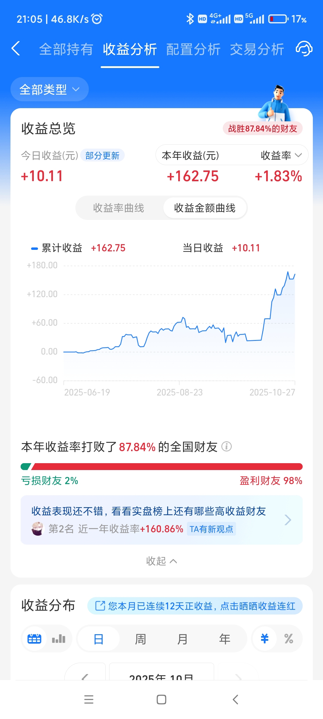 [251027]理财第62天,今天赚了+10.11元,累计盈利+162.75元。