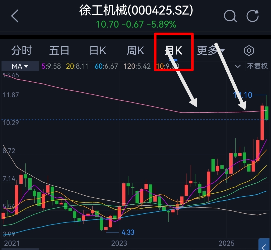 $徐工机械(SZ000425)$ 比如为什么徐工突然砸的这么狠,也是因为月线碰到了年限的致命压力,这也叫共振下跌模型~~