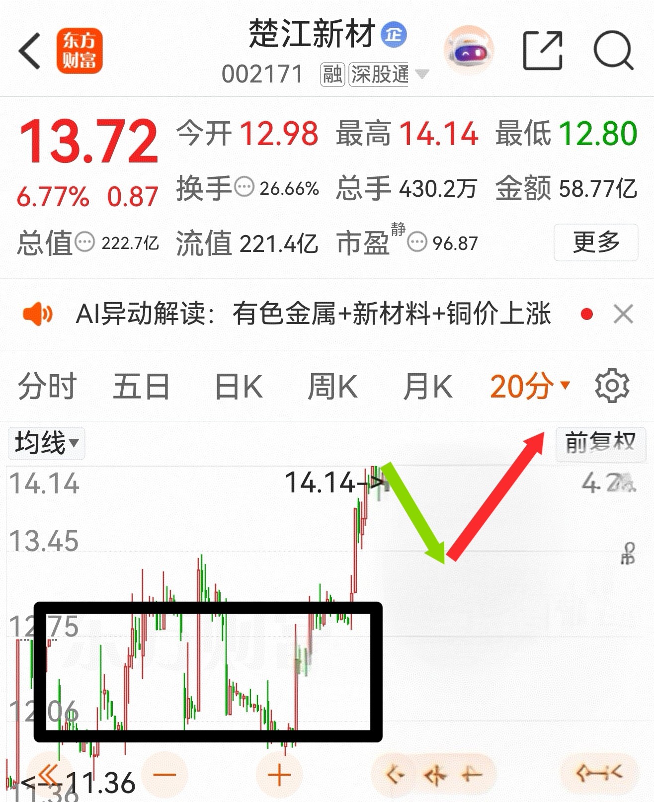 2.楚江新材又“猜”对了,20分钟走势完全符合。接下来看量能会不会配合