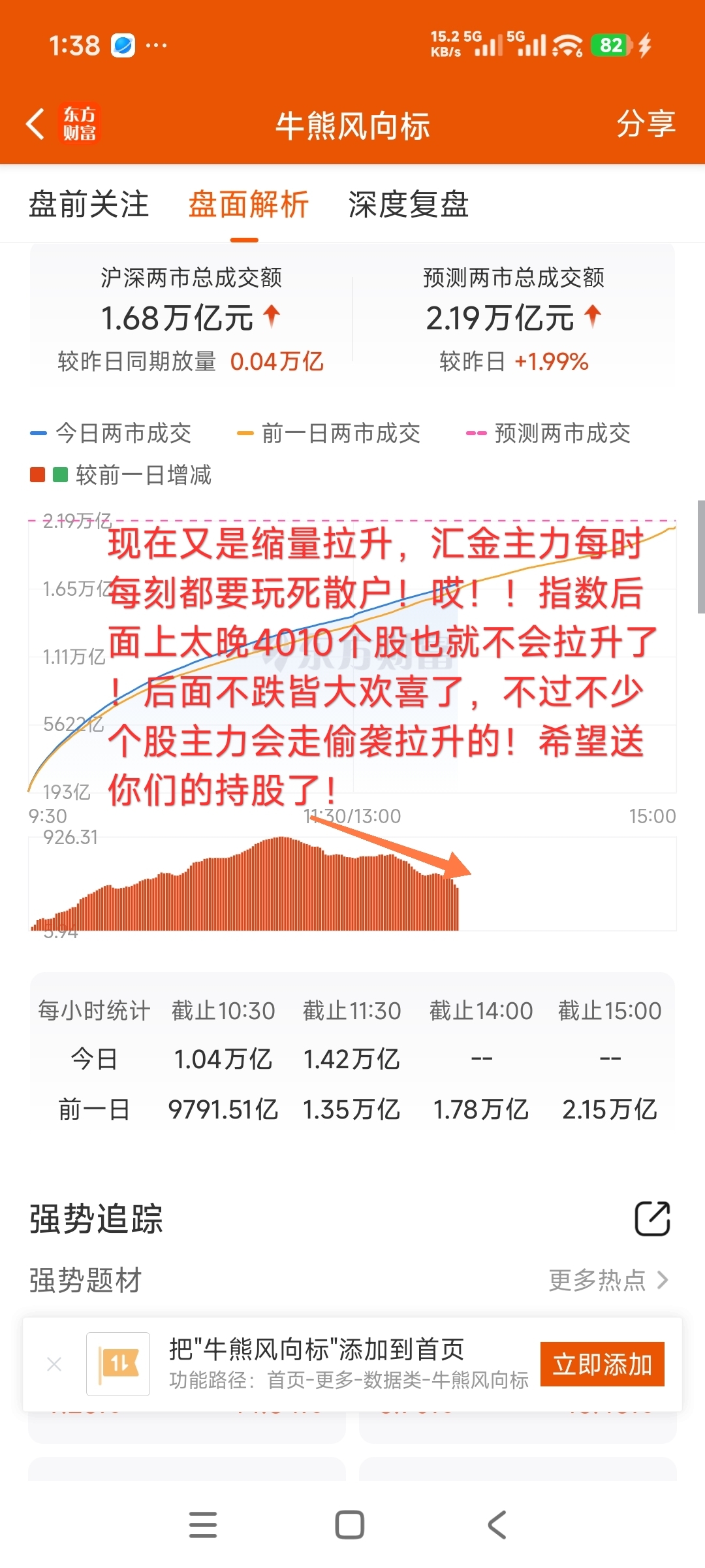 $上证指数(SH000001)$ $东方财富(SZ300059)$ $三六零(SH601360)$ 现在又是缩量拉升,汇金主力每时每刻都要玩死散户!哎!!指数后面上太晚4010个股也就不会拉升了!后面不跌皆大欢喜了,不过不少个股主力会走偷袭拉升的!希望送你们的持股了!