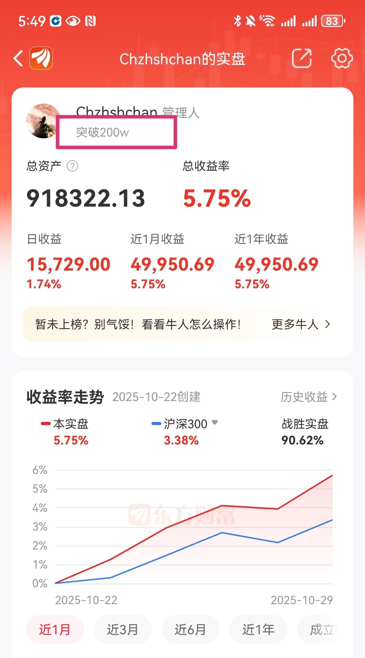 $上证指数(SH000001)$ 发起实盘挑战第7天,突破200w需要用时多久