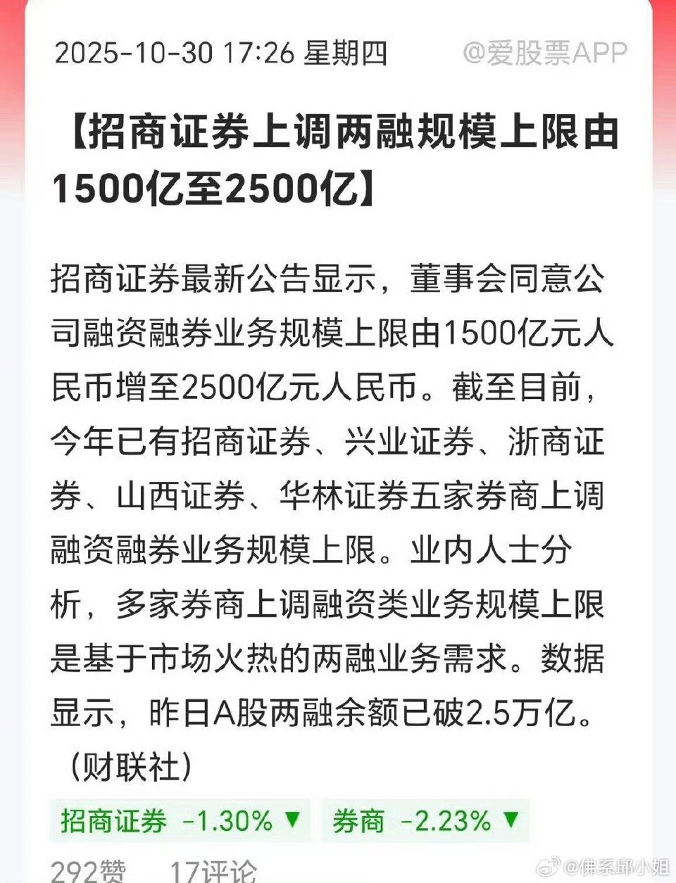 券商又给牛市加杠杆了,招商证券两融规模由1500亿上调到2500亿,增加了100