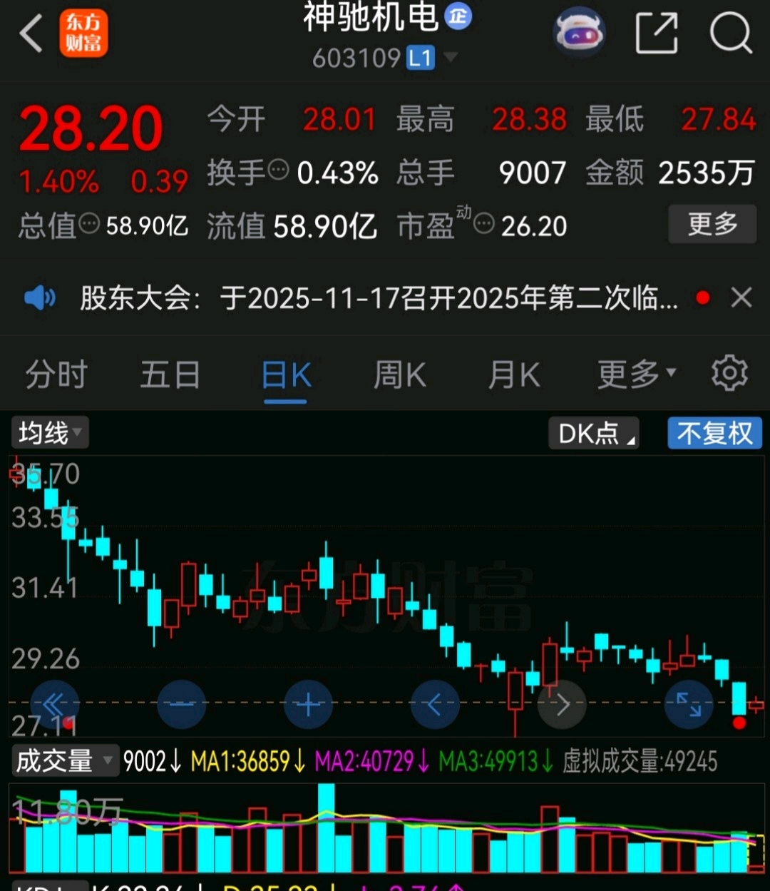 神驰机电,年平台是28.5元,最近两次杀跌28.5元以下,拉起,这次能否再次拉起