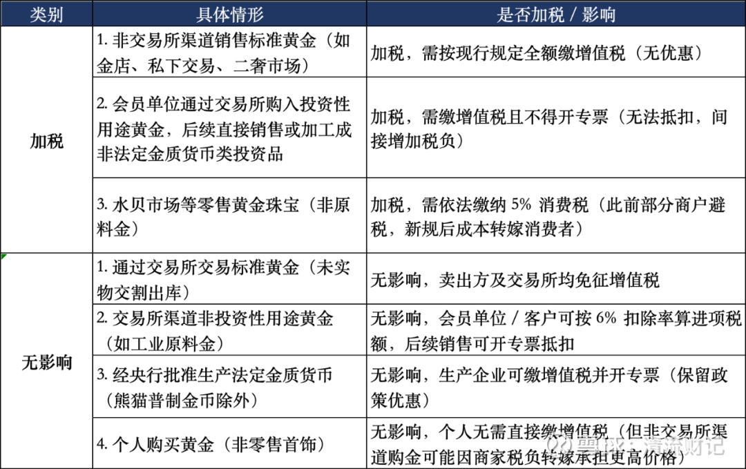 4. 这次调整,主要有两方面的目的:a. 在投资渠道上,鼓励通过交易所等 “线上流通” 的渠道投资(免税),不鼓励实体金条投资等 “线下流通” 的渠道投资(加税),有啥作用呢?打击实体黄金的民间私下流通,你细品。