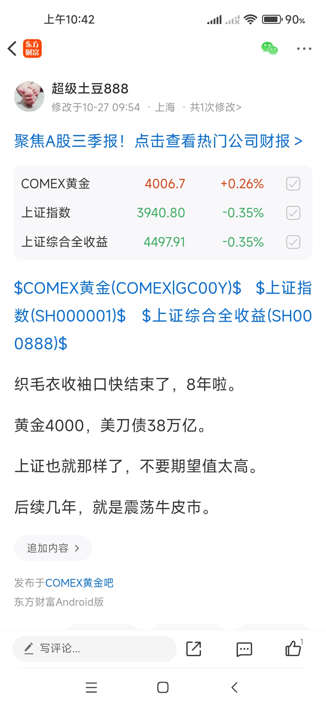 温馨提示: 1.根据《证券法》规定,禁止编造、传播虚假信息或者误导性信息,扰乱证券市场;2.用户在本社区发表的所有资料、言论等仅代表个人观点,与本网站立场无关,不对您构成任何投资建议。用户应基于自己的独立判断,自行决定证券投资并承担相应风险。《东方财富社区管理规定》