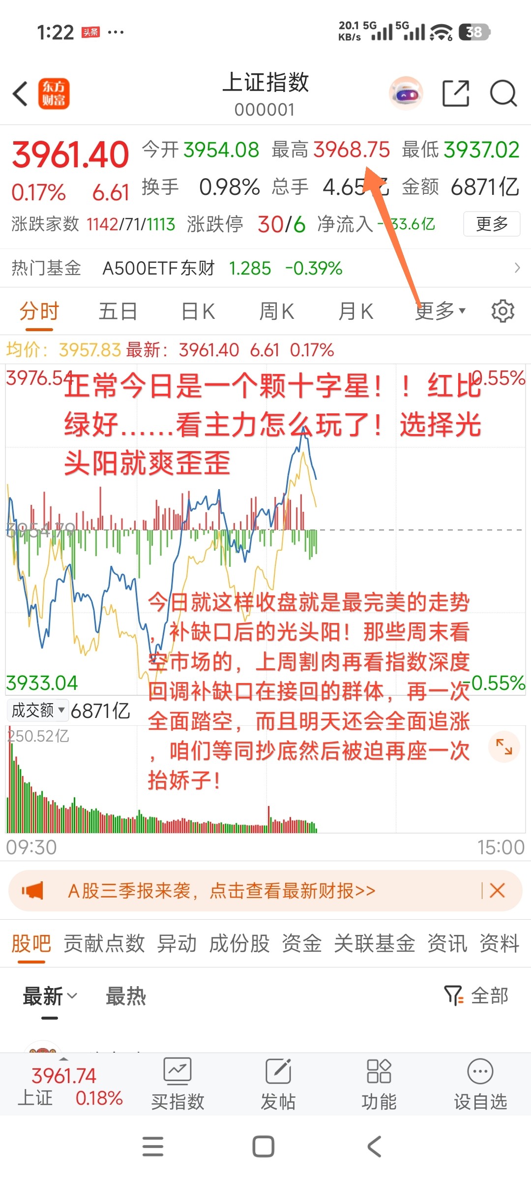 今日就这样收盘就是最完美的走势,补缺口后的光头阳!那些周末看空市场的,上周割肉再看指数深度回调补缺口在接回的群体,再一次全面踏空,而且明天还会全面追涨,咱们等同抄底然后被迫再座一次抬娇子