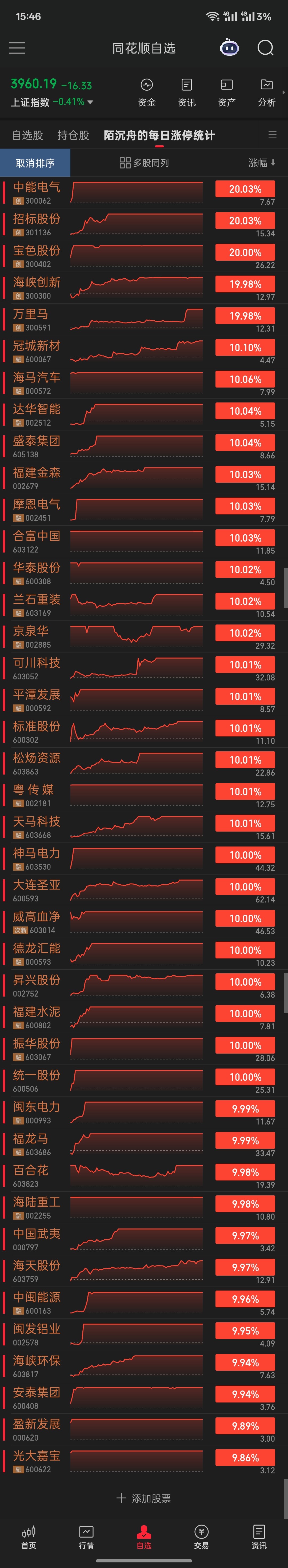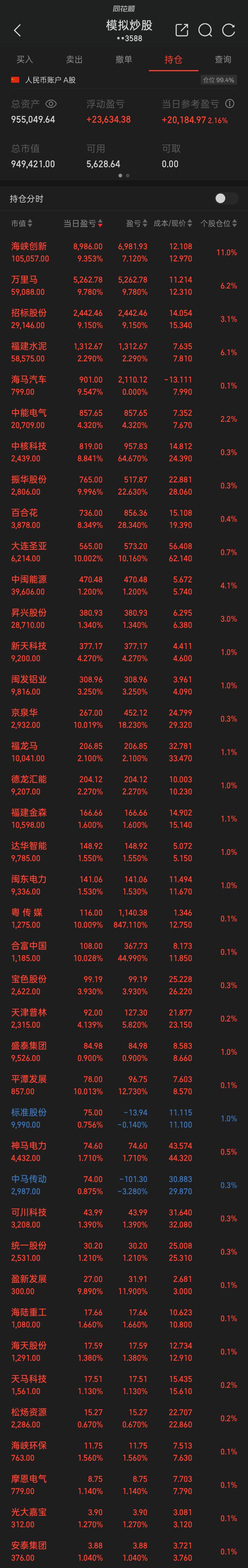 今天持有85只其中41只涨停,总共946了…$上证指数(SH000001)$ #三大指数调整!机构:慢牛根基稳固# #“马”字辈股大涨!“玄学炒股”再现A股?# #银行股逆势走强!行情逻辑是什么?# $银行(BK0475)$ #福建本地股集体爆发!行情逻辑是什么?# $福建板块(BK0151)$ #存储芯片超级周期:DDR5一周涨价25%#