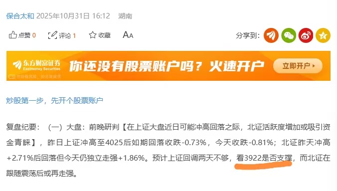 精准卡在3922,碰巧说准了?会不会是有点技术含量?这是我于周五10月31日下午写的。因为冷清、也基于不劝买不劝留的原则,原帖已雪藏,此截图也不涉及个股,这里回顾,也算给自己一点信心和鼓励