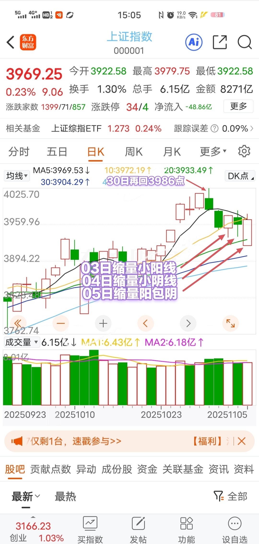 $上证指数(SH000001)$ 2025.11.06周四(0106)放量小阳线或者缩量十字星!