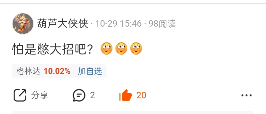 温馨提示: 1.根据《证券法》规定,禁止编造、传播虚假信息或者误导性信息,扰乱证券市场;2.用户在本社区发表的所有资料、言论等仅代表个人观点,与本网站立场无关,不对您构成任何投资建议。用户应基于自己的独立判断,自行决定证券投资并承担相应风险。《东方财富社区管理规定》
