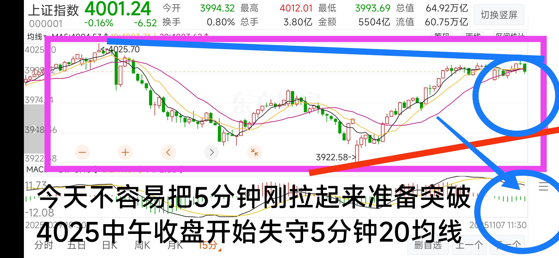 今天不容易把5分钟刚拉起来准备突破4025,中午收盘又开始失守5分钟20均线,下