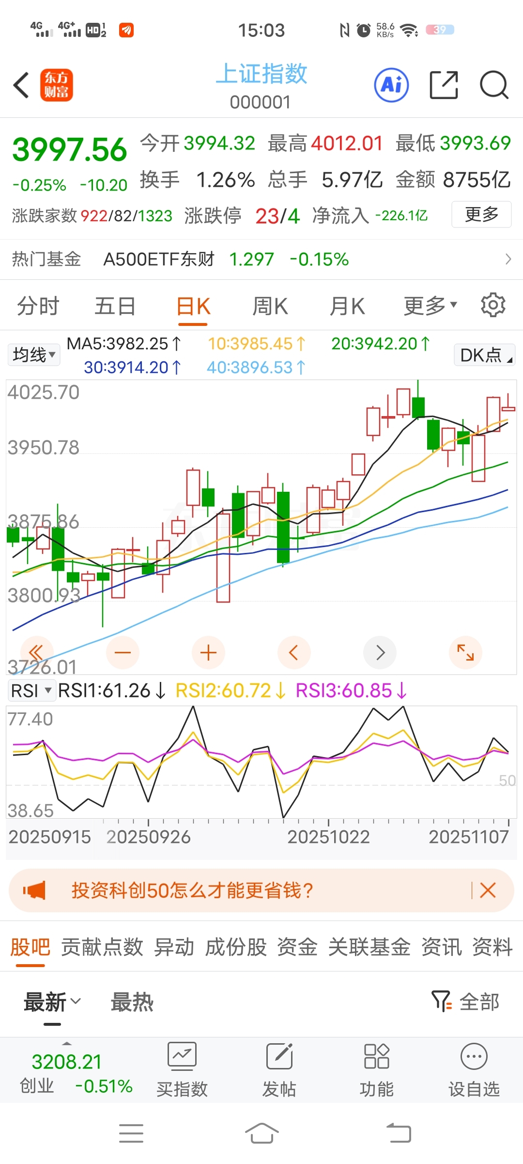 $上证指数(SH000001)$ 2025.11.10周一(0108)缩量,窄幅震荡,收盘站上4000点