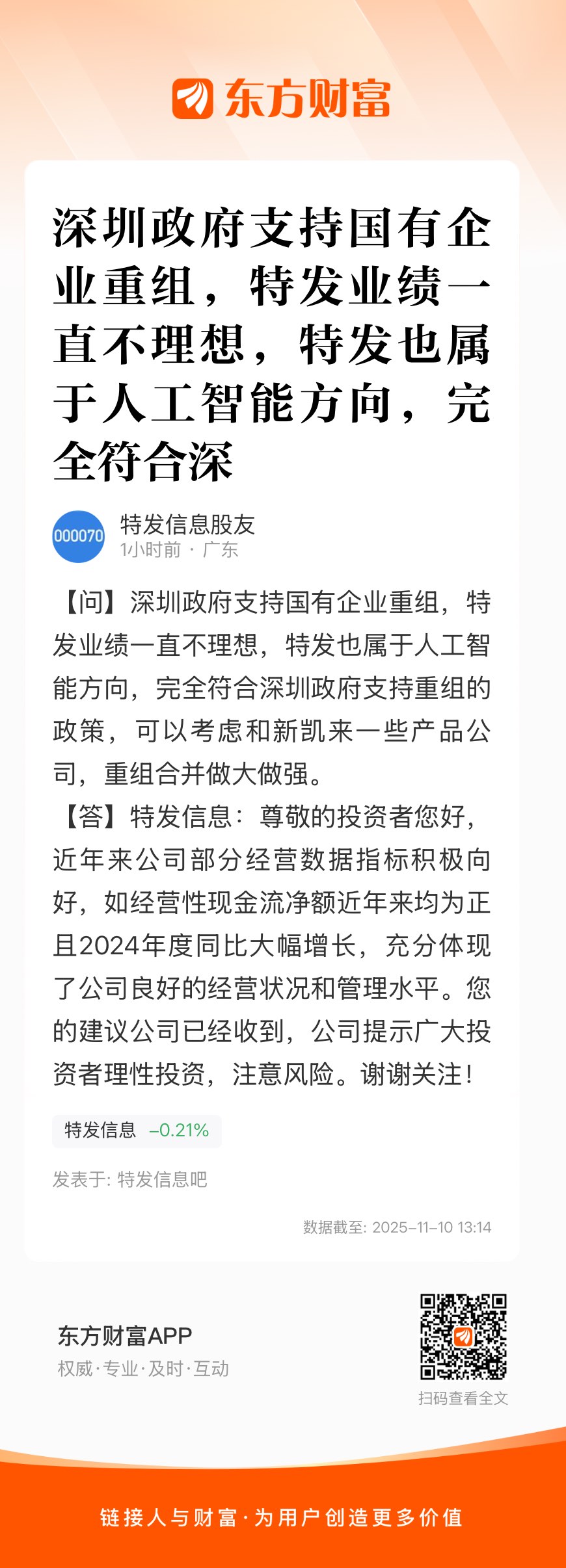 深圳政府支持国有企业重组,特发业绩一直不理想,特发也属于人工智能方向,完全符合深圳政府支持重组的政策,可以考虑和新凯来一些产品公司,重组合并做大做强。