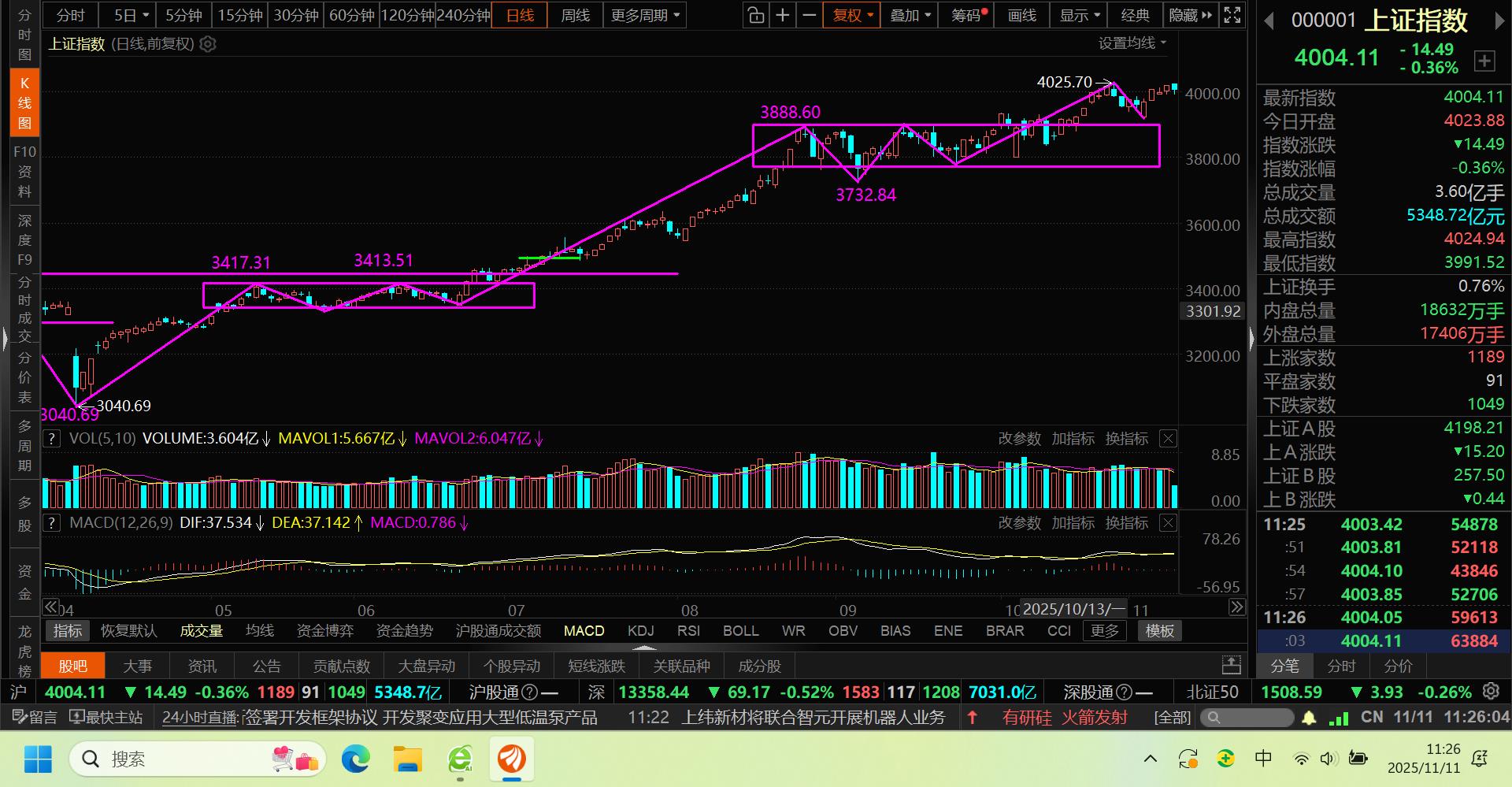 11月11日,4月以来的上证指数,两个中枢的上涨完成了,量能极度萎缩,感觉只差最