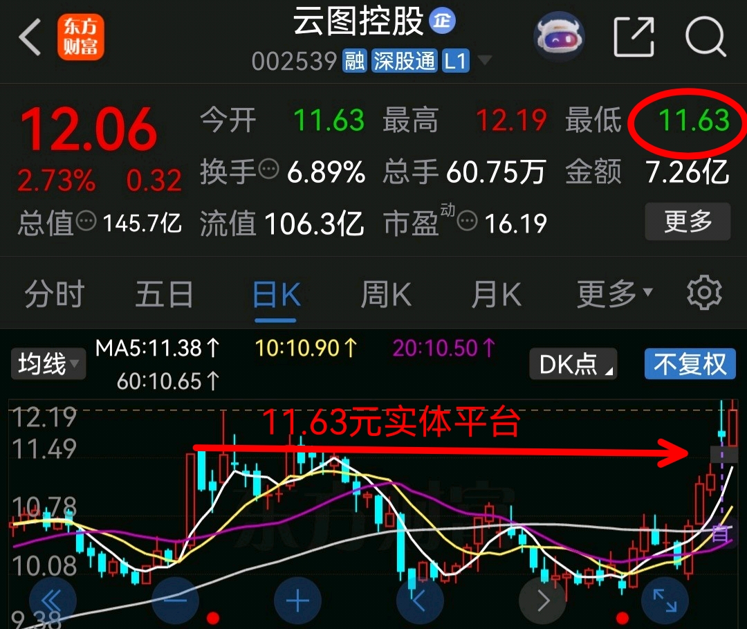 昨天周一大幅高开,冲高回落,今天低开拉起……关键11.63元就是前面平台,