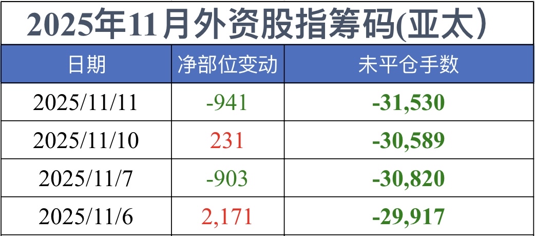 1、今日(11月11日)外资股指期货数据:-941/-31530(今日外资股指期货在亚太市场加仓了941手空单,剩余空单数量是31530手。)