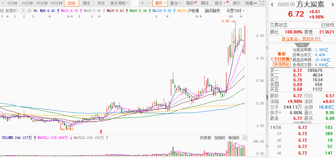 方大炭素:固态电池能源概念,该股二连板拉升后高位一直不温不火的震荡,时间换空间,均线趋势上移后形成支撑,周二开始首板涨停反包了最近两天的阴线调整,封单高打1.3个多亿,有开始加速迹象,本身该股就处于拉升初期,整体位置中低位,还有较大拉升空间,另外兹金本身现在就聚焦在能源概念里面,所以还有继续上冲空间。