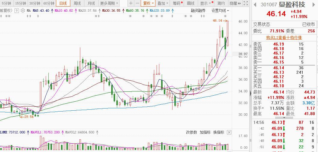 显盈科技:消费电子+统揽高速连接器。该股从21年发行到现在4年,股价重新回到历史高点附近,创业板虽然周二没有涨停,但股价突破近期42的箱体高点,这个压力一年多了,创出新高后主升浪进一步转强,而且该股是在连续调整两天后重新反包形成上涨底分型加速形态,量也温和放大,可以看看早盘机会。