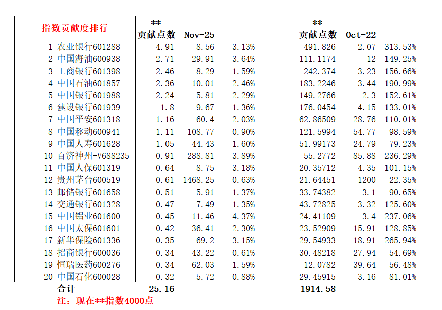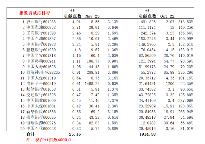 从2022年10月下旬到2025年11月中旬,**指数前20公司贡献点数1900