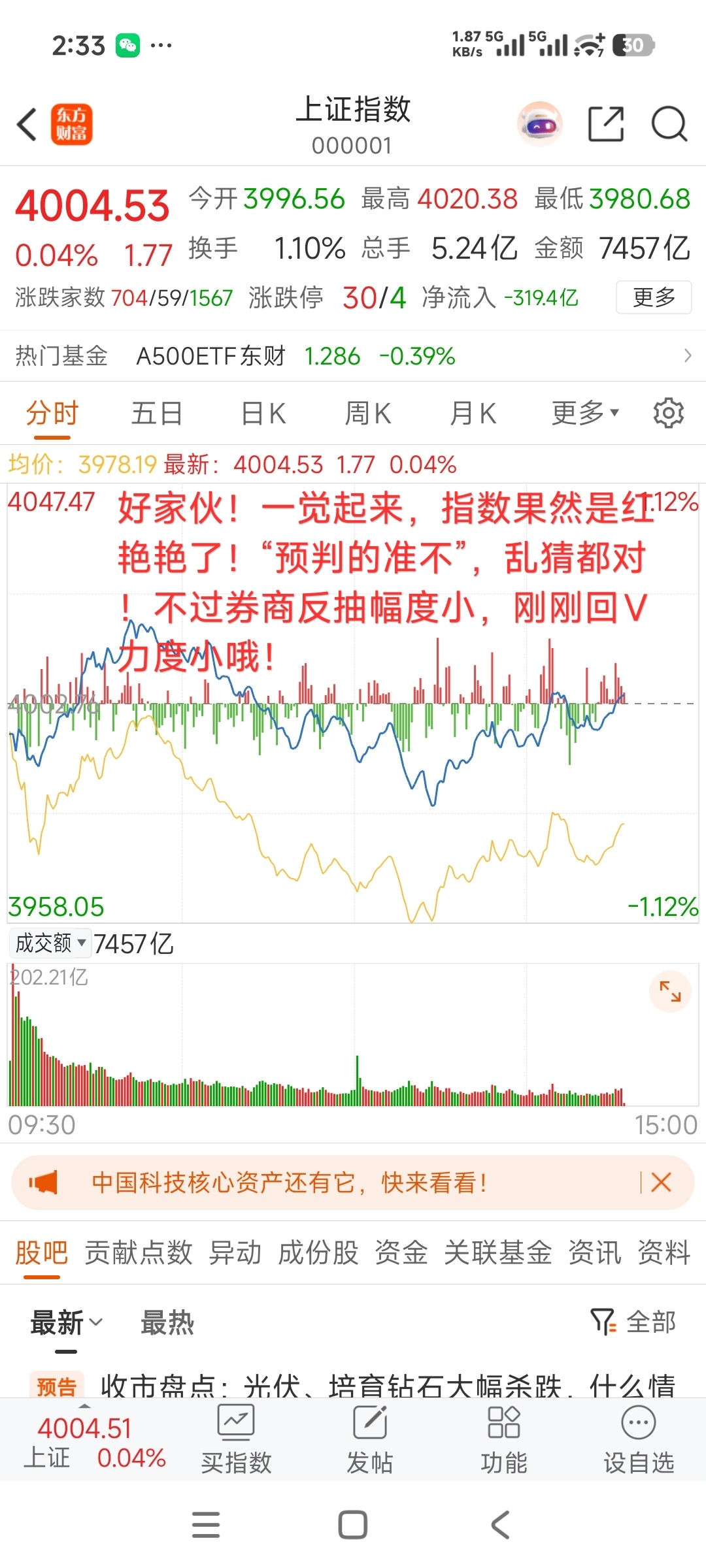 好家伙!一觉起来,指数果然是红艳艳了!“预判的准不”,乱猜都对!不过券商反抽幅度小,个股回V力度小哦!