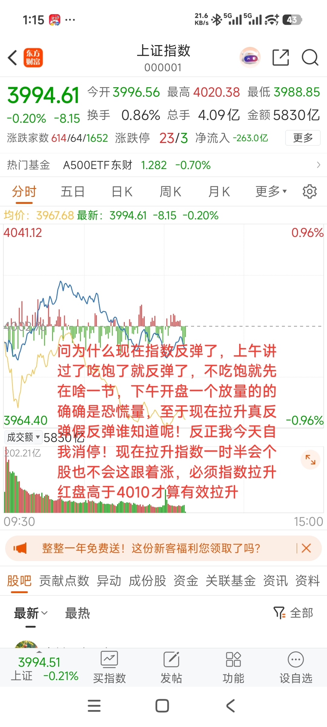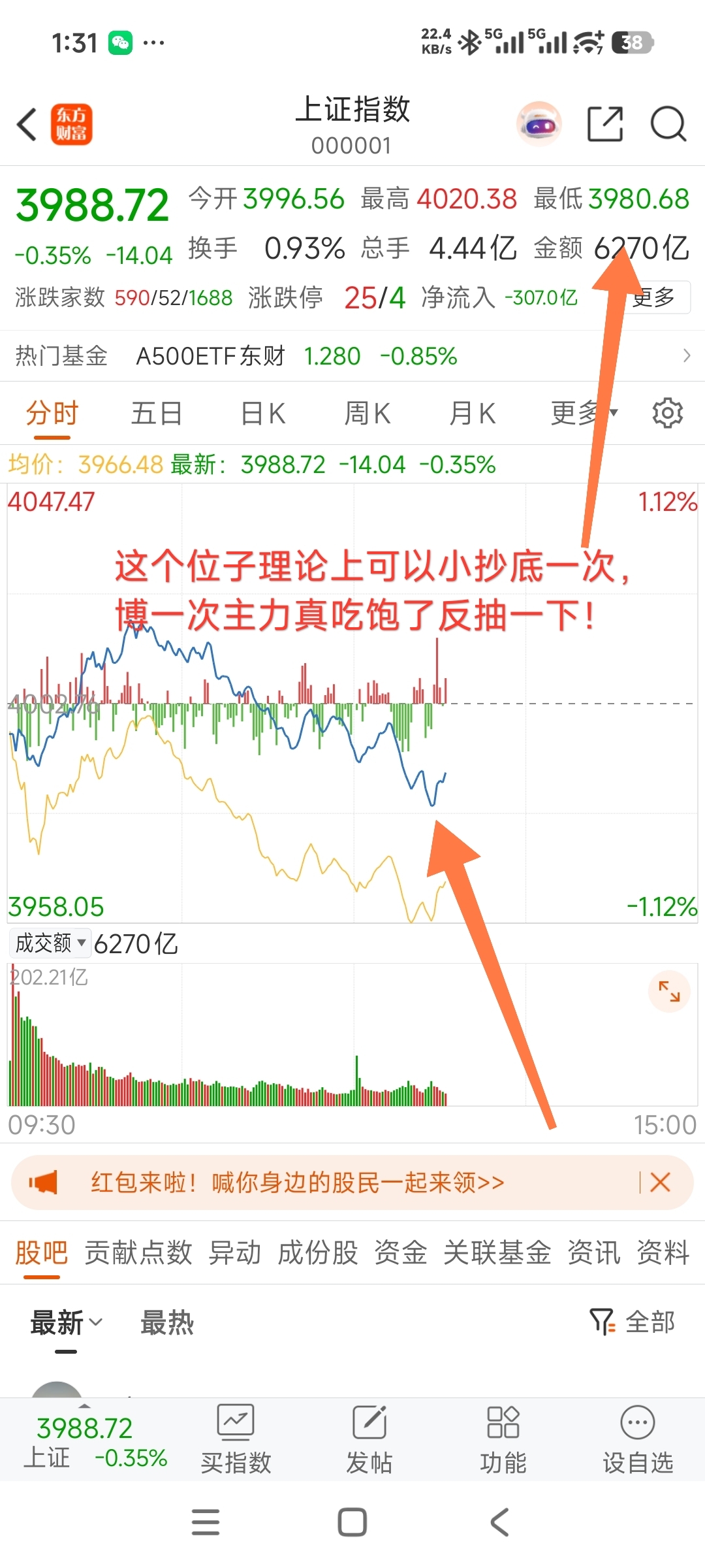 $上证指数(SH000001)$ $三六零(SH601360)$ $东方财富(SZ300059)$ 下午反抽真假只看是否能上4010了,现在4008只差临门一脚了!加油!