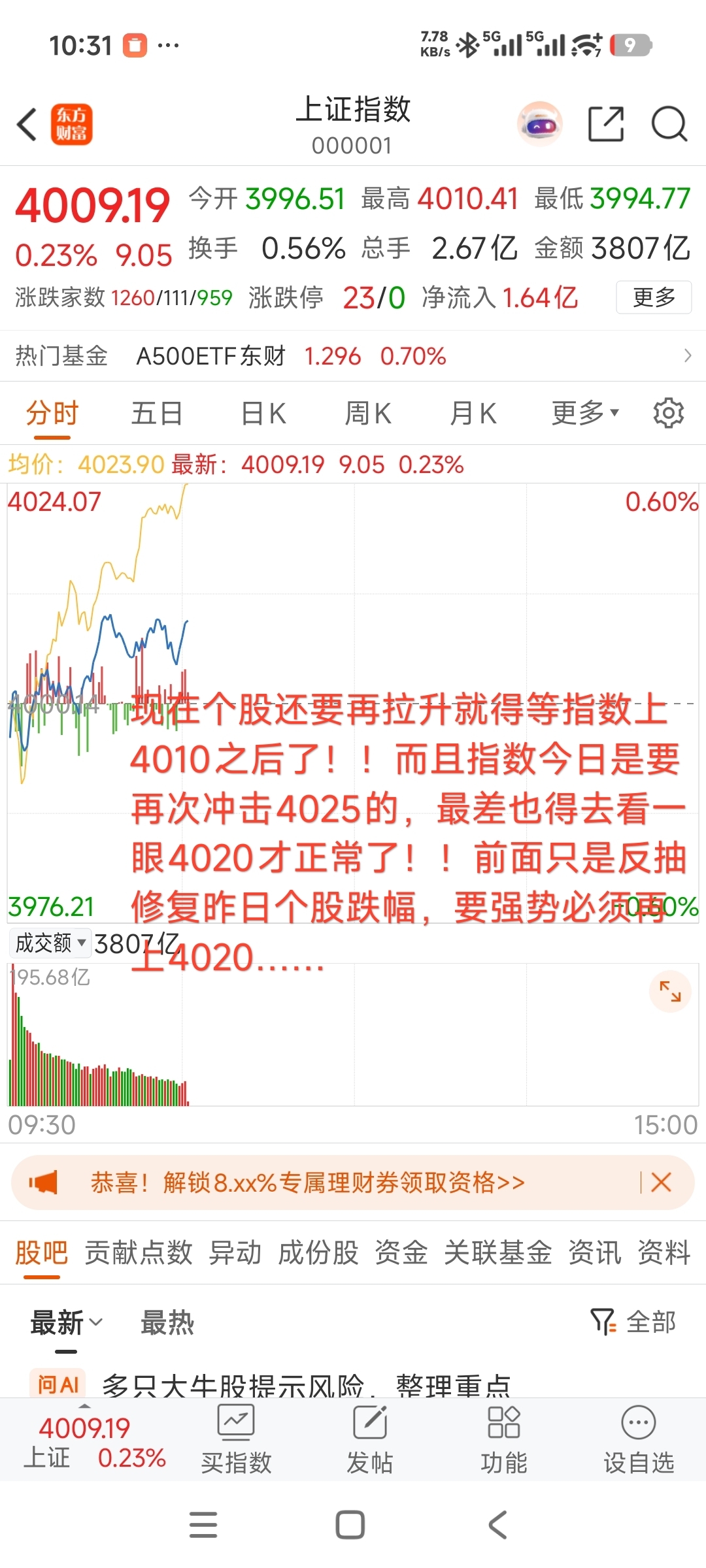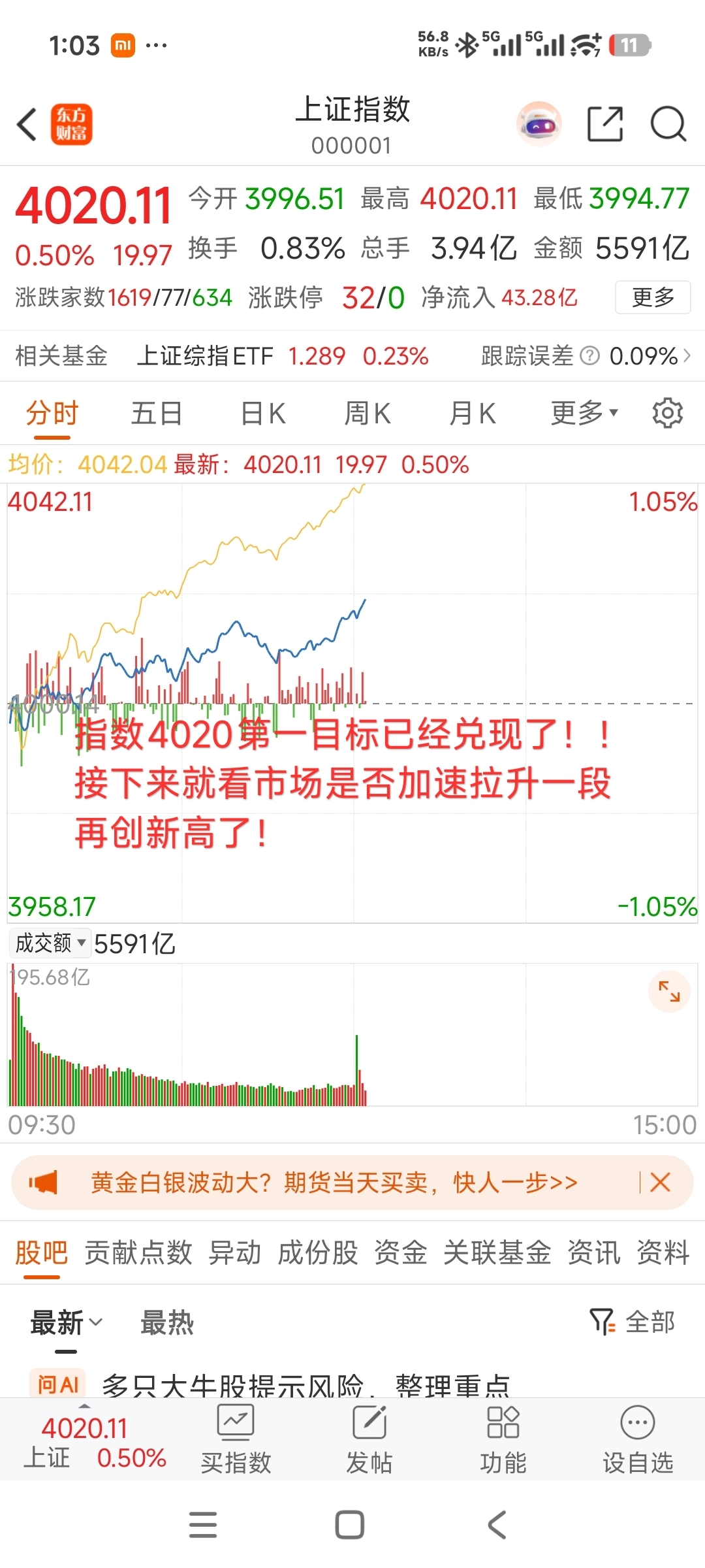$上证指数(SH000001)$ $三六零(SH601360)$ $东方财富(SZ300059)$ 指数4020第一目标已经兑现了!!接下来就看市场是否加速拉升一段再创新高了!