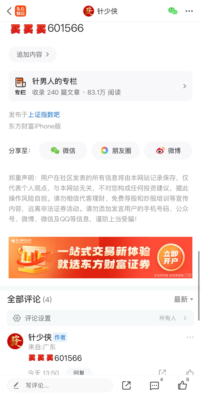 温馨提示: 1.根据《证券法》规定,禁止编造、传播虚假信息或者误导性信息,扰乱证券市场;2.用户在本社区发表的所有资料、言论等仅代表个人观点,与本网站立场无关,不对您构成任何投资建议。用户应基于自己的独立判断,自行决定证券投资并承担相应风险。《东方财富社区管理规定》