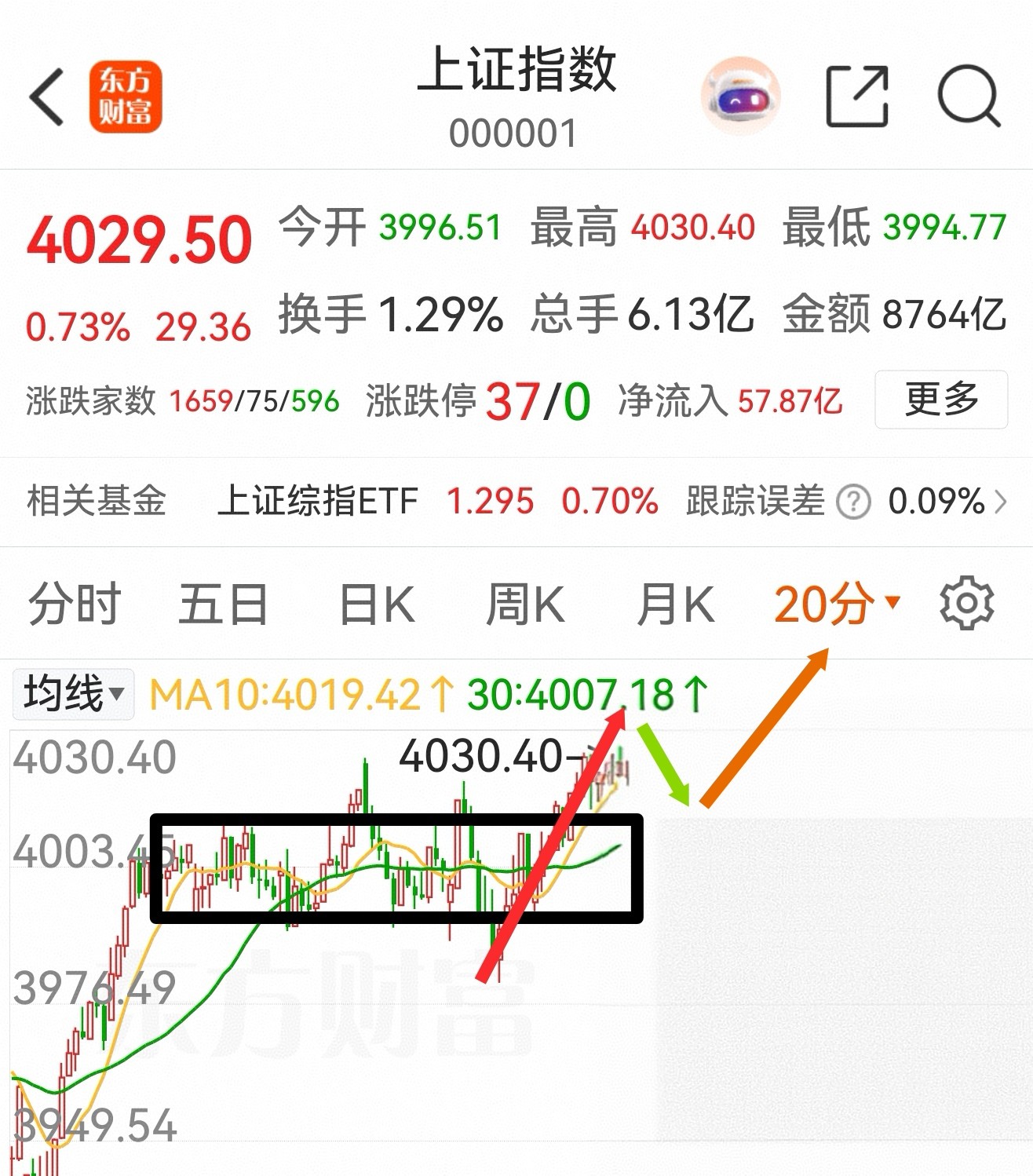 当下大盘20分钟正在走红箭头,待明日回测黑色箱体后,有望走黄色上涨箭头,是加速还是犹豫不决,那得问主力!