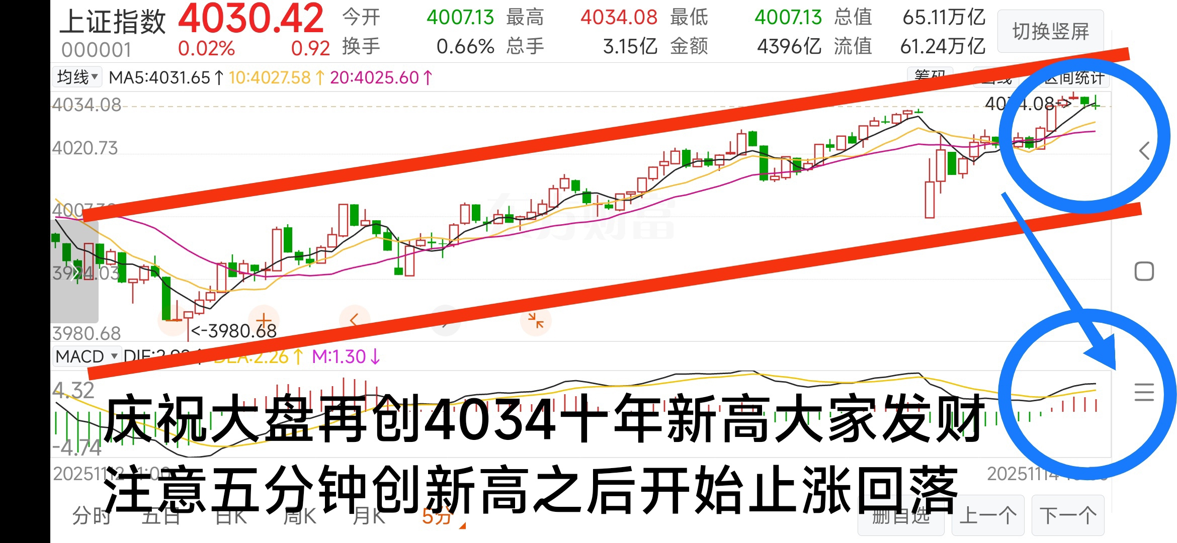 祝贺大盘再创4034十年新高!希望大家个股大涨发发发?注意大盘五分钟创新高之后开