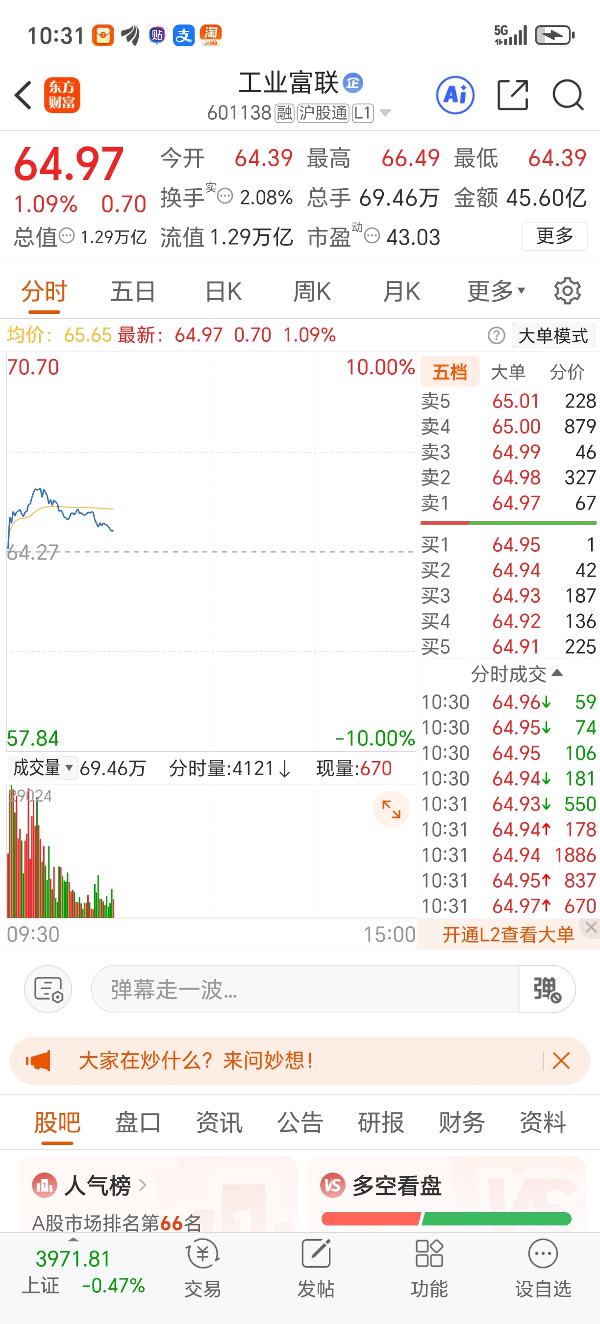 $上证指数(SH000001)$ $工业富联(SH601138)$ 工业富联64.92没进的,挂65.02全仓进最后的全仓抄底机会!拿到周三上午高点全出出我可以百分之百确定一定大赚#杨德龙:4000点或是新一轮行情的起点# #美股再遭猛烈抛售!发生了什么?#