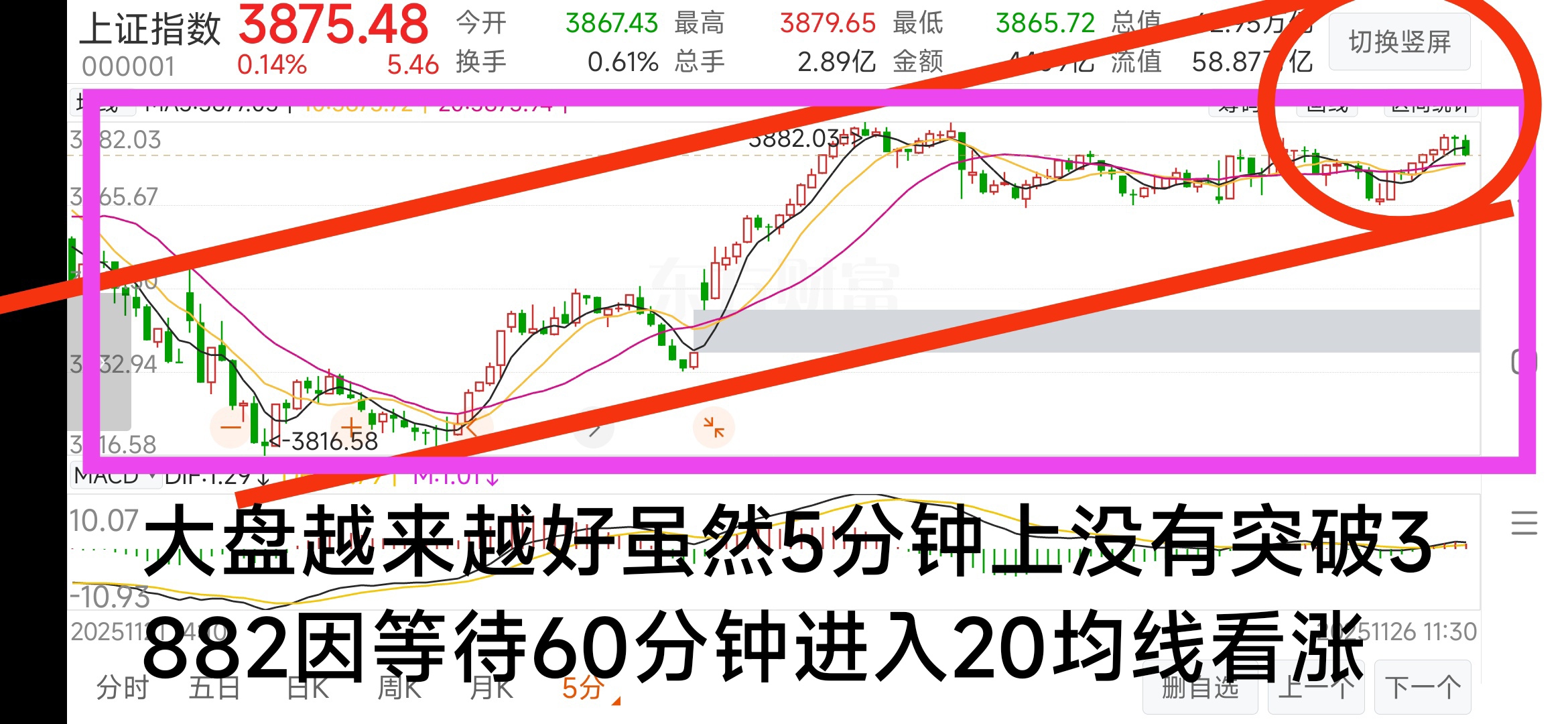 大盘越来越好,虽然5分钟上午没有突破3882箱顶,目前5、15、30分钟已经进入安全区,下午只要60分钟20均线进入安全区,能够站上继续看涨保留好该有的仓位。