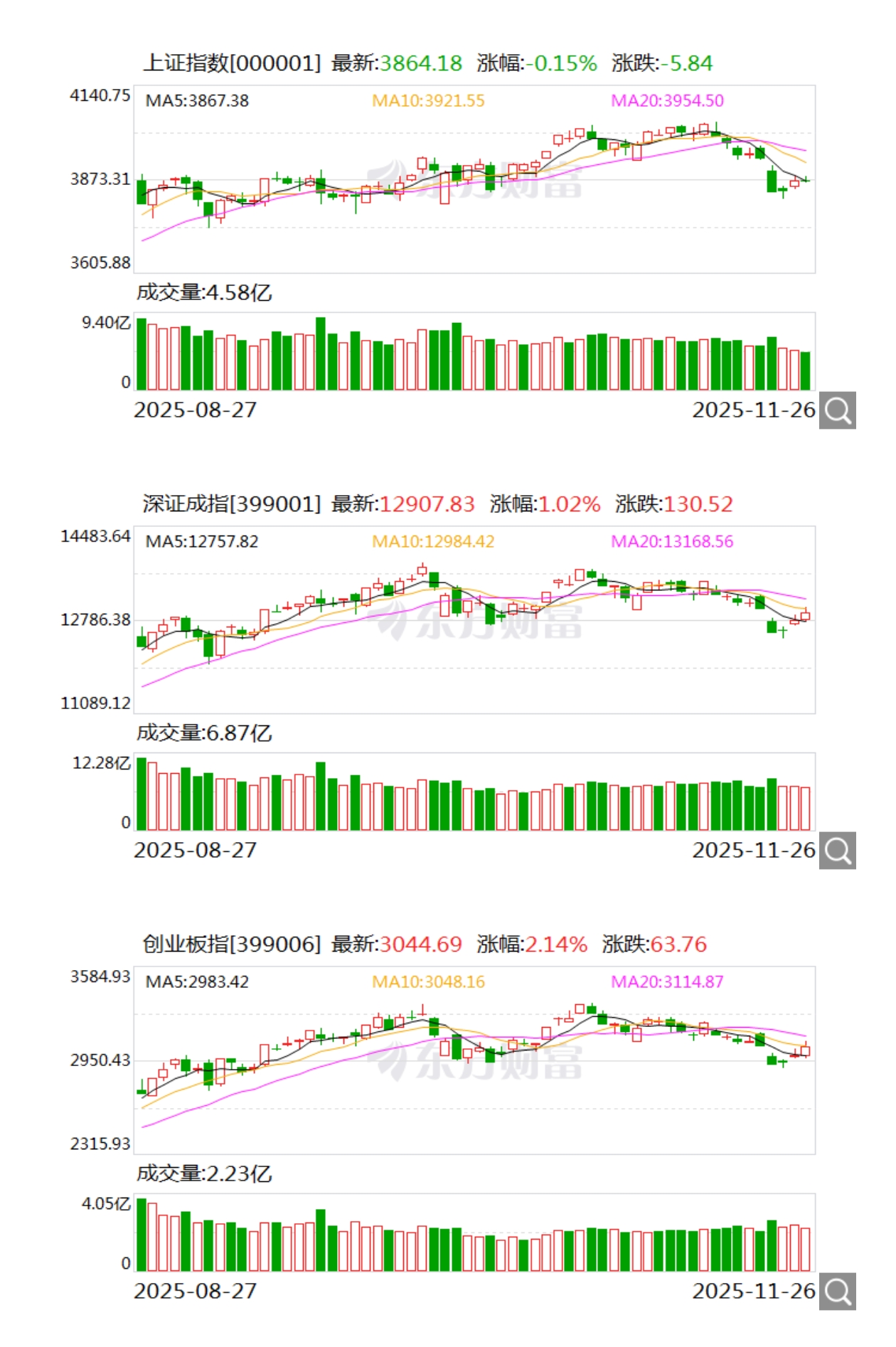 A股三大指数今日涨跌不一,截止收盘,沪指跌0.15%,收报3864.18点;深证成指涨1.02%,收报12907.83点;创业板指涨2.14%,收报3044.69点。沪深两市成交额17833亿,较昨日小幅缩量288亿。